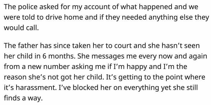 Six months later, Lucy hasn't seen her baby, and OP receives messages from random numbers asking her if she's happy for causing everything. OP blocked her on everything, but Lucy keeps finding ways to message OP, who is now starting to doubt her decision.