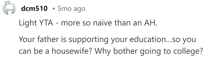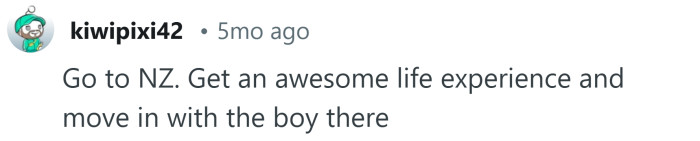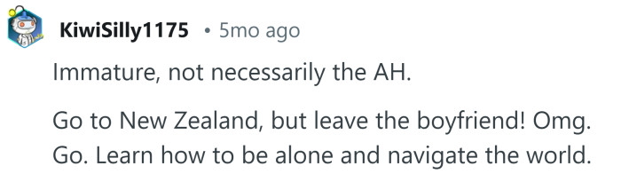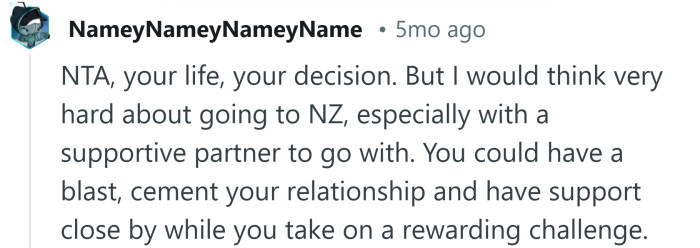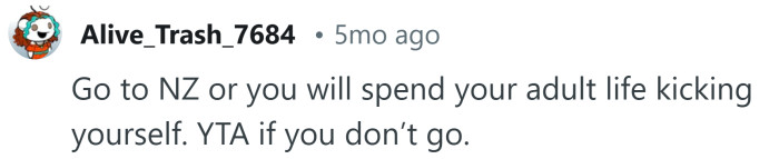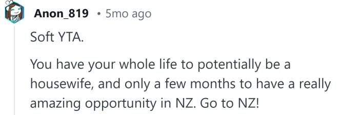 I (22F) have been really lucky that my parents have supported me financially throughout my education. Since they divorced, my dad has been the one covering most of my school expenses. I’ve never had to worry about student debt, and he even supported me when I changed my major. I’m incredibly grateful for that.When I chose my current major, one of the things I was most excited about was the opportunity to do a paid internship in New Zealand after graduation. My whole family knew about it—it was kind of “the plan” from the beginning: graduate, then head to NZ for work experience.They also know that I’ve always dreamed of getting married young, having a big family, and becoming a housewife. Whenever I mentioned that, they’d just laugh and say things like, “Life will surprise you,” or “Don’t rush it.” Lately, things have gotten more serious with my boyfriend. We’ve started talking about marriage and building a life together. He’s even mentioned proposing when I graduate (in about a year and a half—I took a gap year and switched majors). He’s supportive of the internship and even suggested we move to NZ temporarily while I do it. But honestly, the idea of staying, moving in together, and starting our life right away makes me really happy. That’s the path that feels right to me.Last night, my mom took my sisters and me out to dinner. She was telling us how proud she is of us and mentioned how proud she is that I’m going away soon. I said something like, “Well, nothing’s set in stone—who knows if I’ll end up going.” She got really upset and asked what I meant by if, and why I wouldn’t go.I didn’t feel comfortable telling her about my relationship plans yet (since I know we’re still young and things can change), so I just said I didn’t want to plan out my entire life and wanted to go with the flow. She got even more upset and said, “Well, you’d better go, because your dad is already saving up for it.” I told her that if I end up not going, he can use the money for something else. We ended up going in circles until she left the restaurant.Now I’m conflicted. I don’t want to seem ungrateful. I’m aware my dad has done a lot for me, and I deeply appreciate it. But I also don’t think I should be forced into something just because it was expected of me, especially if my life is heading in a different direction. So, AITA?Edit: I want to thank you all for all the feedback and advice. However, I forgot to add that my family has a lot of traditional values, and I don’t know if they would let me go if my BF is going to NZ as well, or if they would help me pay for if if he’s going.Here's how the Reddit community reacted.