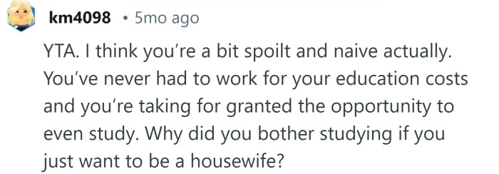A 22-year-old Redditor says she has always been aware of how fortunate she is to have parents who supported her financially throughout her education. After her parents divorced, her father continued covering most of her school costs, sparing her from student debt and even backing her decision to change majors.