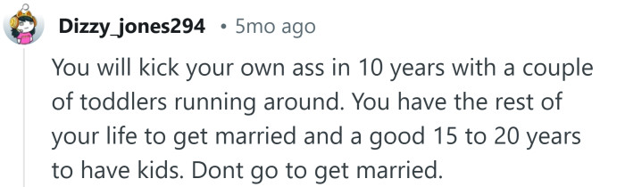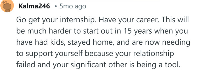 At the same time, the Redditor admits she has always envisioned a more traditional future for herself. She’s dreamed of marrying young, having a large family, and becoming a housewife—ideas her family often brushed off with laughter and reminders not to rush life.