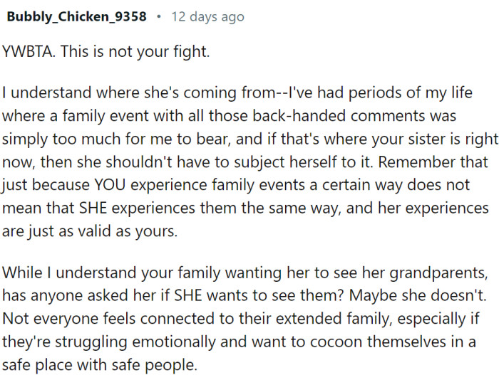 OP understands that it's her sister's choice, but she thinks the reasoning is somewhat selfish. She's also feeling the pressure to stand up for her sister's choice to their parents, which is no easy task. Additionally, OP believes it's a bit self-centered for her sister to think everyone would be focused on her instead of the bride.