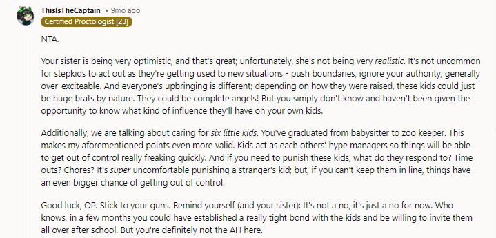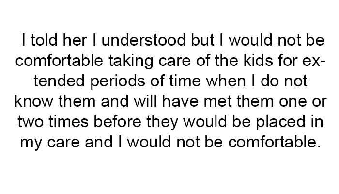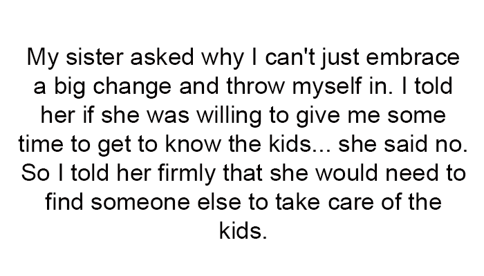 Her sister’s insistence on immediate care for the new kids without prior interaction feels rushed and unreasonable. The decision to end the agreement reflects her boundaries and comfort level, though it has sparked accusations of being exclusionary.