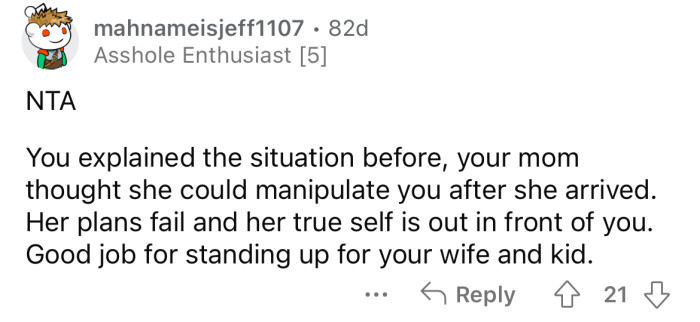 Everything was fine until the OP's mother started demanding to spend time with his wife and child.