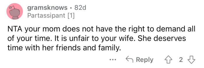 When the OP reminded his mom that his wife would be spending time with her friends, a fight ensued, and his mom told him he was being selfish. Now the OP is wondering if he's the a**hole here.