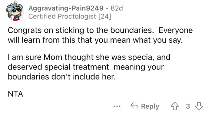 In this situation, the Redditor's assertiveness in enforcing boundaries can serve as a model for other family members, demonstrating the importance of self-advocacy and respect.