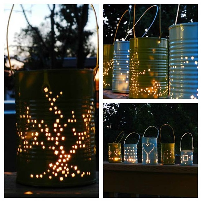 "Tin cans become gorgeous lanterns with a coat of paint and a few holes."