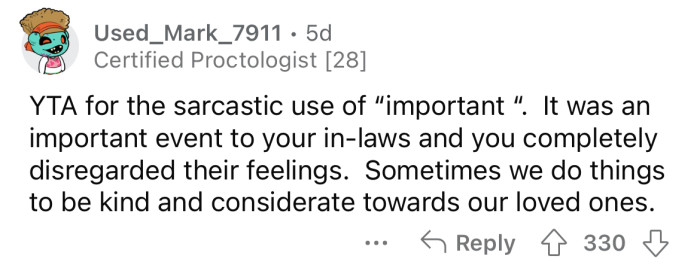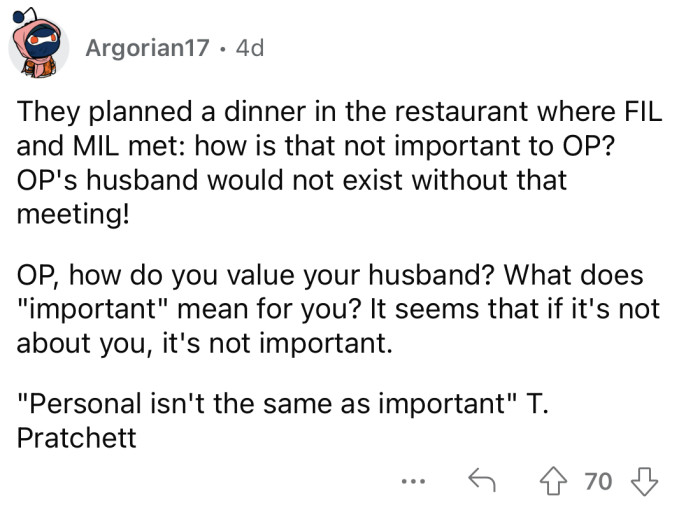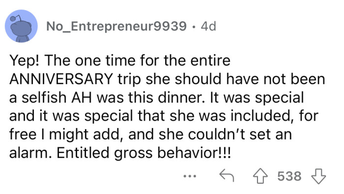 The OP wasn't impressed, and the conversation quickly became heated. OP's MIL told her that she swore off paying for her to attend another family vacation after she ruined their anniversary trip with her selfish behavior.