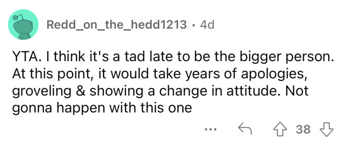 Now the OP is wondering if she should have "been the bigger person." Keep scrolling to see how people reacted.