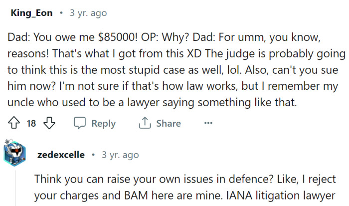 "Dad: You owe me $85,000! OP: Why? Dad: For, umm, you know, reasons!"