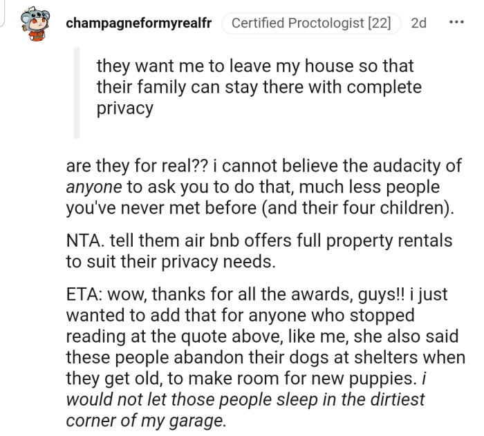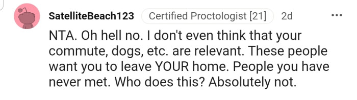 The Reddit community has rallied behind OP on this matter. The commenters are furious that a group of strangers is even bold enough to ask her to leave her home.