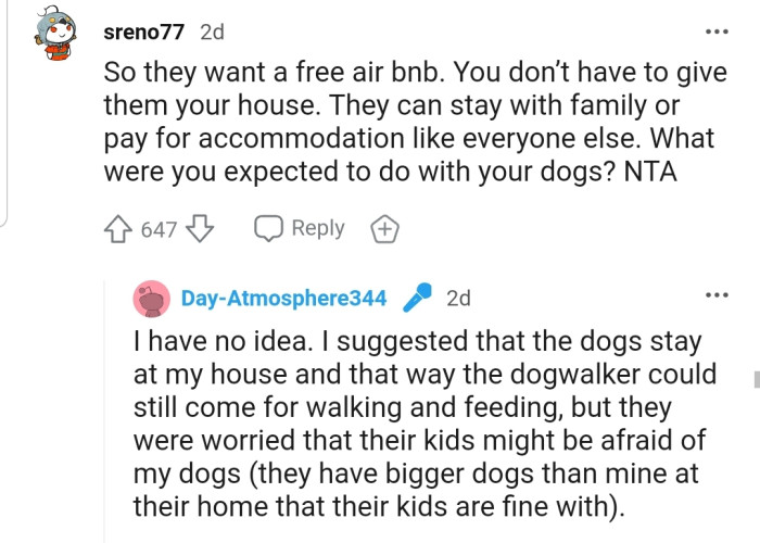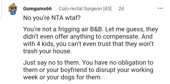 Regardless, OP didn't waste time rejecting this request, citing the immense discomfort it would cause her. Beyond that, surrendering her living space to virtual strangers and their young children creates understandable unease.