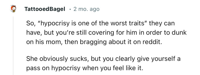 "You’re still covering for him in order to dunk on his mom, then bragging about it on Reddit."
