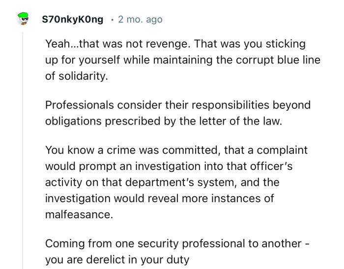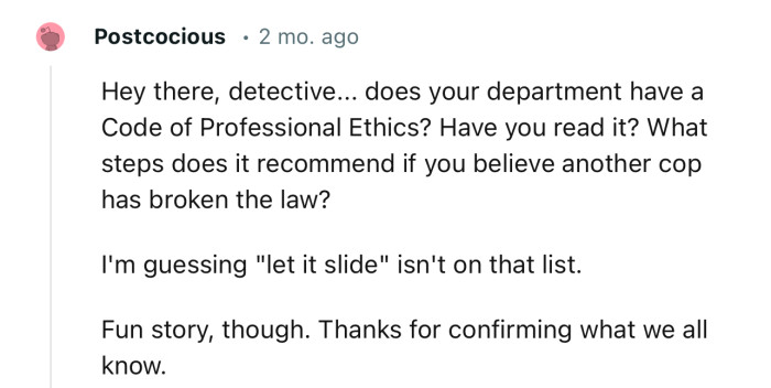 However, several commenters were disappointed with OP’s decision not to make a report. In addition, they accused him of covering up for a corrupt cop so that he could have something to brag about online.