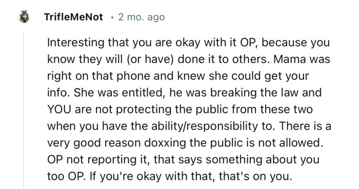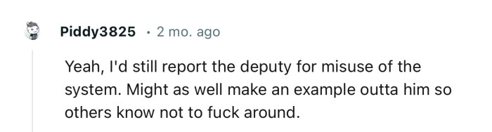 Things got even more intriguing when she escalated the situation by calling her son, who was a deputy. He revealed OP’s full name to her, probably unaware it was a serious breach of protocol.
