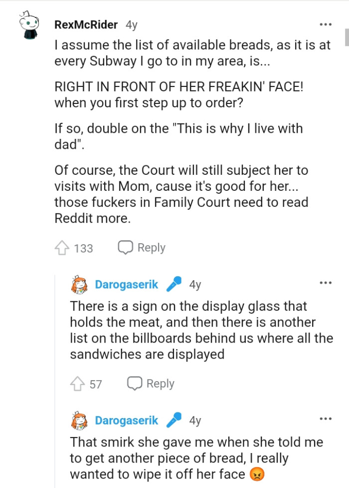 The girl I mentioned before, who talked back, had her hours significantly cut. Basically, a lady said she wanted avocado, but when she was paying, she didn't want to pay for the avocado because it was too much. So Carmen opened up her sandwich and took it off. They got into a fight, and Carmen told her, "Don't want to pay for avocado? You don't get avocado."I thought that would be the right approach. She deals with a lot of racist slurs from people too. She's Mexican, and she has a visa to be here. Her English isn't the best, so people get really irritated with her and call her all kinds of names.I hope she could sue for that, but even if she could, we're all broke because we work at Subway.The Daughter Does Have Some Sense