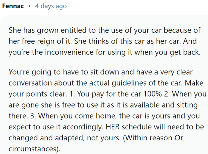 This scenario underscores the significance of establishing boundaries in familial relationships, particularly regarding shared resources.