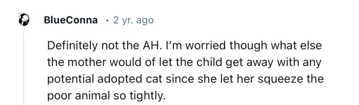Despite OP’s polite refusals, the mother remained unyielding, even allowing her child to manhandle the cat. When OP attempted to rescue the distressed feline, the mom berated OP for laying hands on her child and even threatened to call the police.