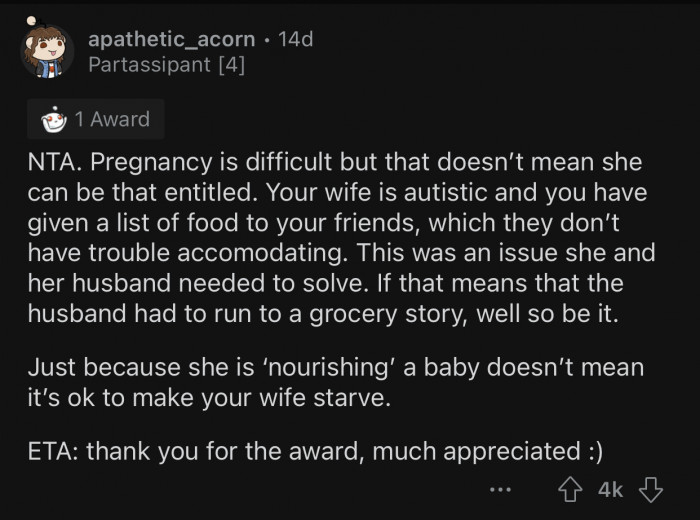 Reddit: r/AmItheA**holeOP's wife, Jane, is autistic and only consumes certain foods.