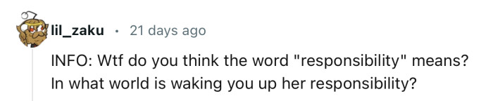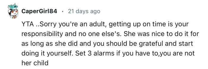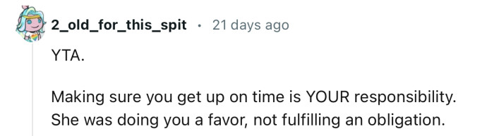This brazen entitlement upset Gwen—she found it unacceptable that OP felt she was obligated to wake her up every morning. In her words, OP was "ungrateful" for having been woken up all this time.