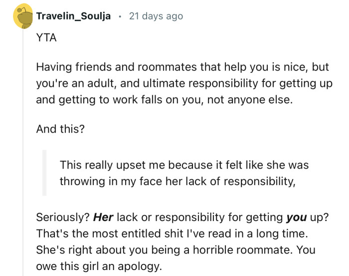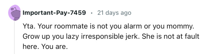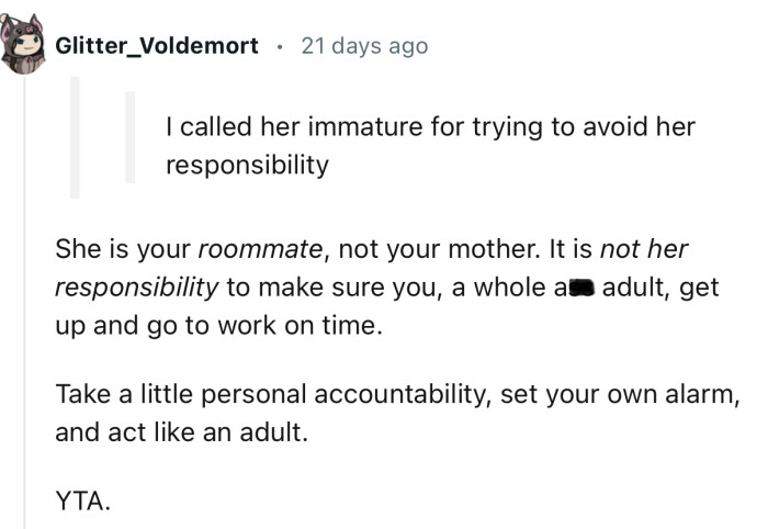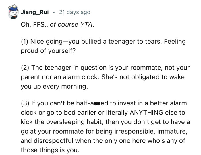 Entitled Redditor Reduces Roommate to Tears for Failing to Perform Her "Customary" Duty of Waking Her Up for Work