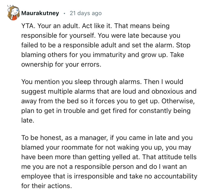 "You're an adult, and ultimate responsibility for getting up and getting to work falls on you."
