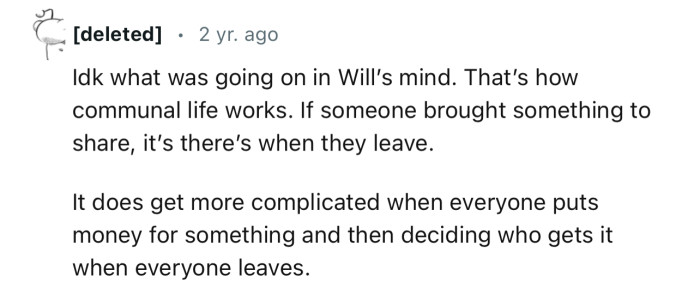 As one Redditor said, if someone moves into a shared apartment with property, it’s still theirs when they decide to leave. Maybe someone needs to explain this to Will like he’s a fifth grader.