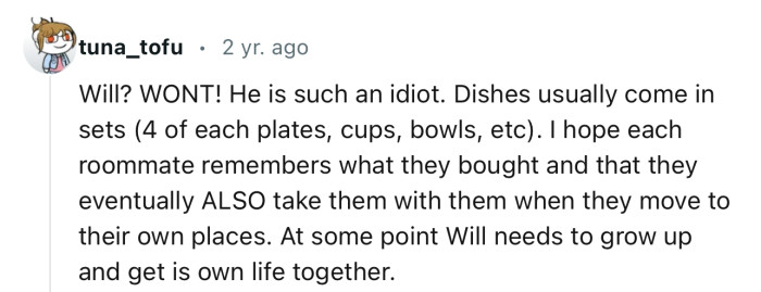 While two of the roommates resolved to split the cost of replacing what OP had decided to take, one of the occupants, Will, wasn't willing to let OP leave with any of their belongings.