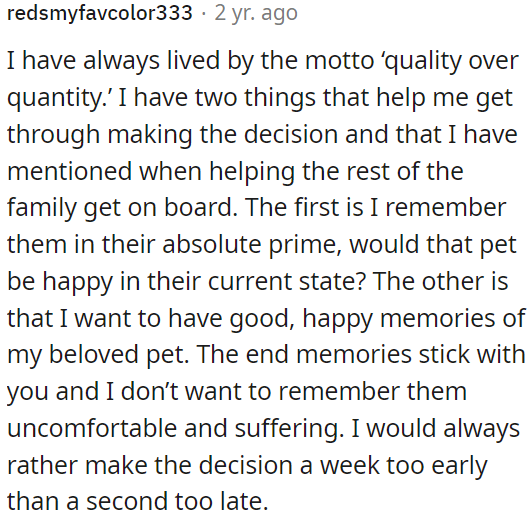 The dog should have a peaceful and happy final time, not feeling scared or lonely. Remember, it's about making sure the dog has a good quality of life, even if it's for a shorter time.