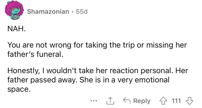 In this case, the decision to prioritize a holiday over attending a funeral may reflect an attempt to cope with overwhelming emotions in a way that feels manageable.