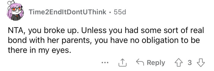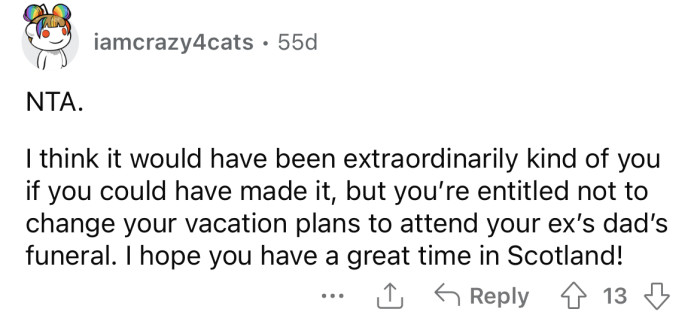 When the OP's ex called him to tell him when the funeral was, he informed her that he couldn't go because he'd be on vacation.