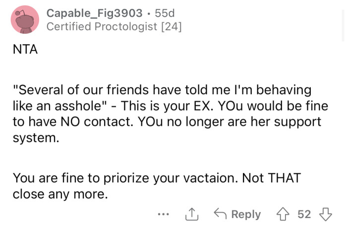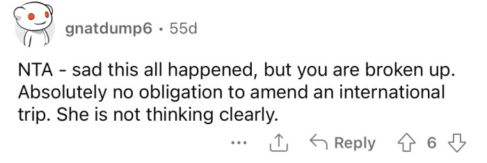 Reddit/Pretend_Inflation988The OP was crushed but decided to go on their planned vacation alone.