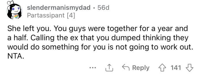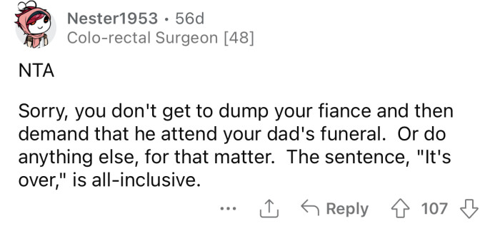 Reddit/Pretend_Inflation988He explained that he had asked his partner's father for permission to propose to her, but she broke up with him shortly after they got engaged.