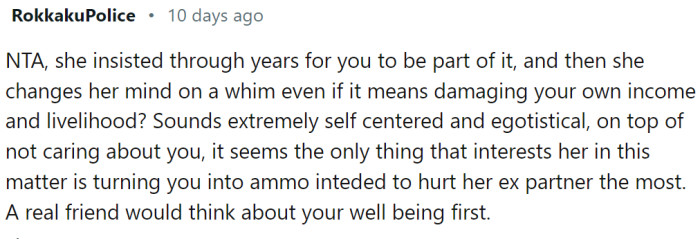 Now, OP is caught in a tough spot. They do not want to give up the business they have devoted so much to, but they also value their friendship with Carina. They are questioning whether they are the bad guy for not wanting to quit working for Jack.