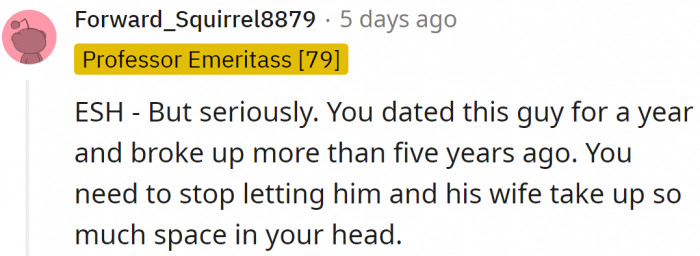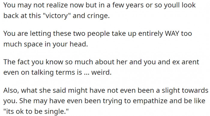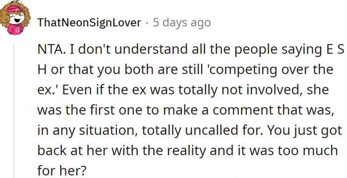 However, her reaction was a bit excessive when the OP responded. It seems that OP isn't quite over her ex, and if this claim is true, she needs to move on with her life.