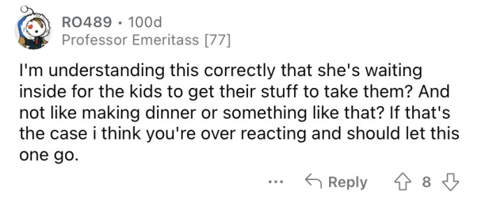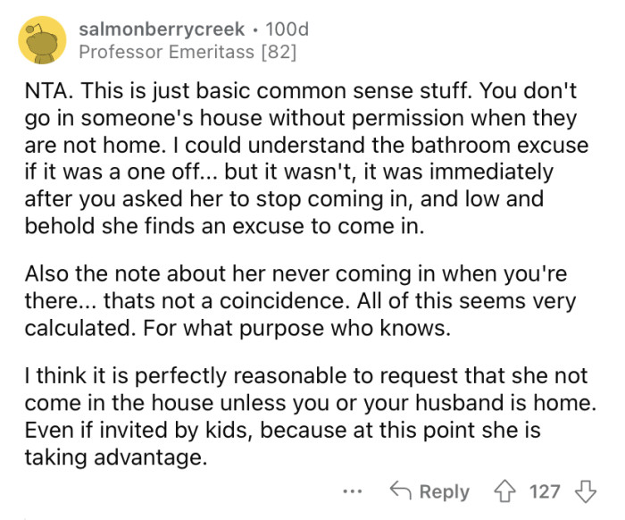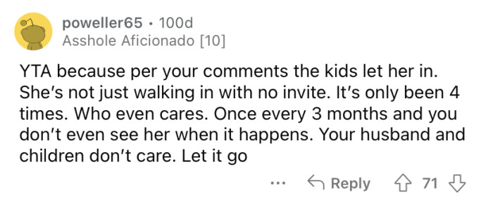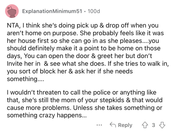 Reddit/Shorty_sept78She says her husband's ex has only seen the kids four times in the four months they've been living there, and each of those times, she has let herself into their house when they weren't home.