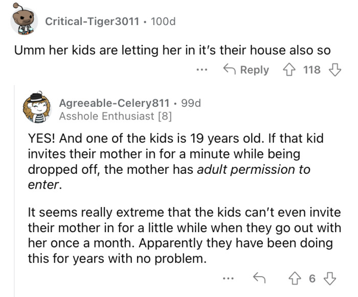 Reddit/Shorty_sept78The OP and her husband have had arguments about it because she believes it is disrespectful for his ex-wife to enter their home uninvited.