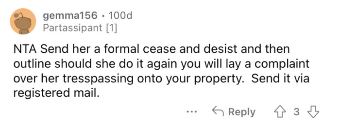 She has been told that the OP does not want her to come inside the house, but she continues to enter uninvited.
