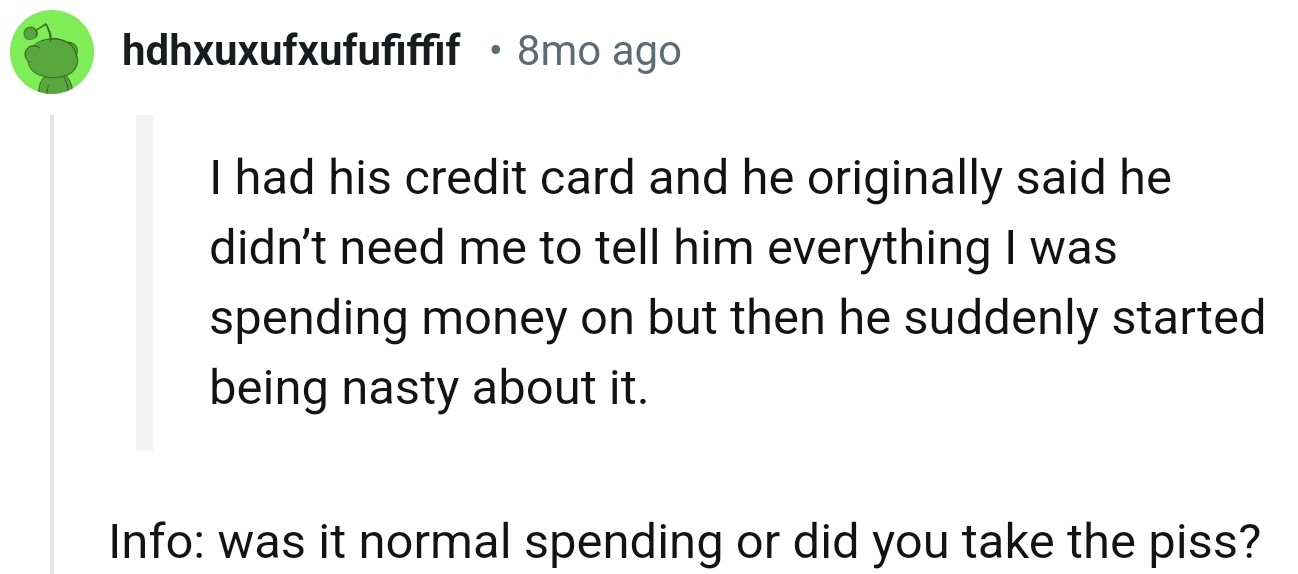 He handed over his credit card and claimed she didn’t need to report every expense. But soon enough, he turned into a control freak.