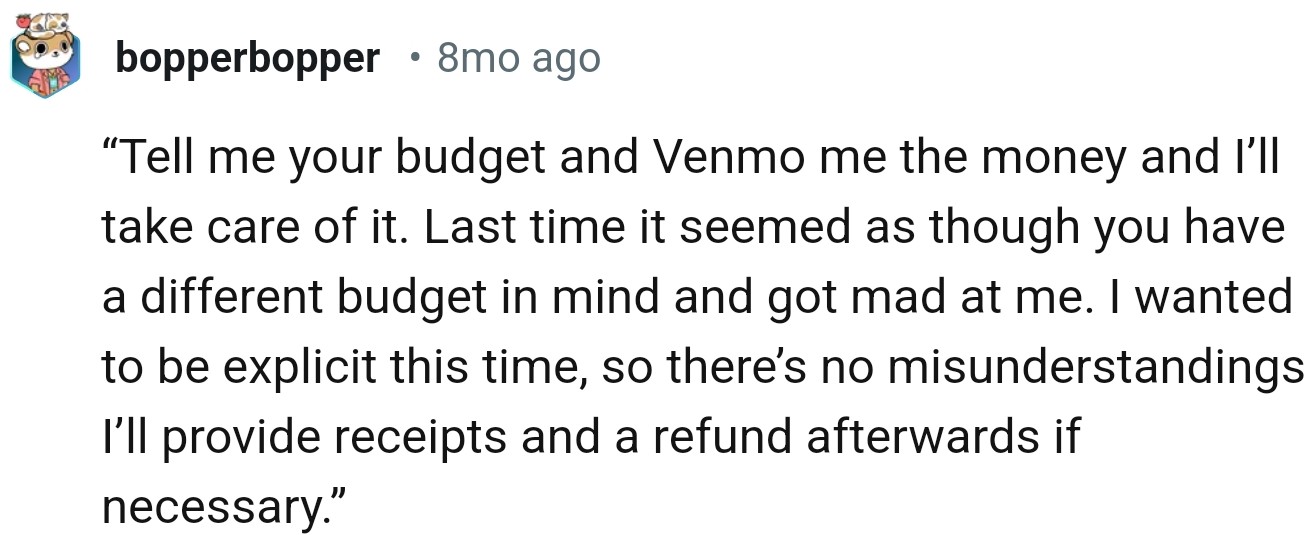 They advised OP to document everything in case of future family court issues. They also suggested setting a clear budget upfront to avoid haggling and drama.