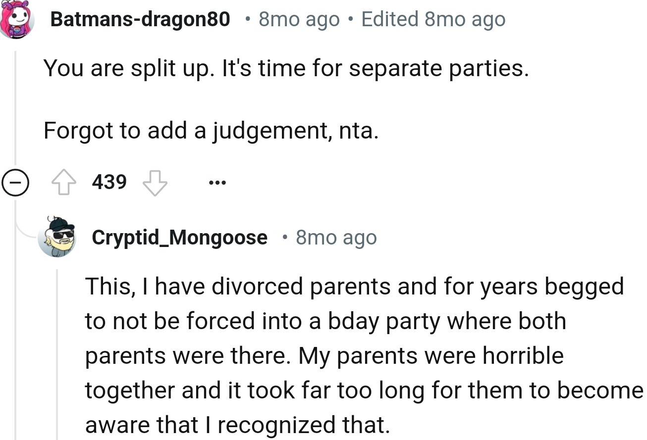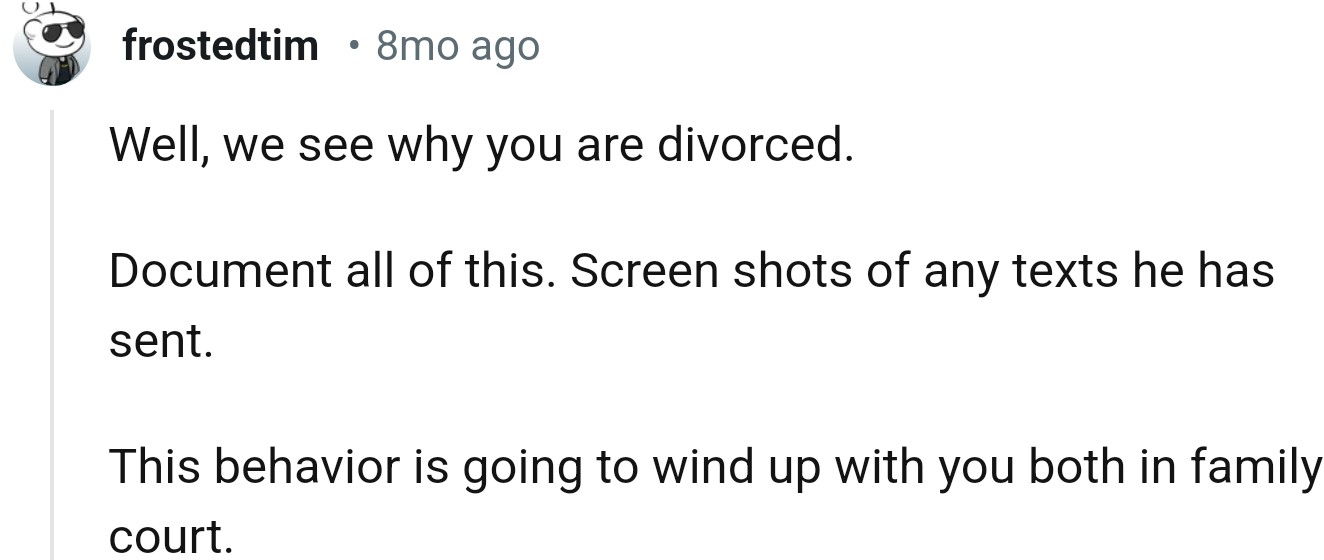 Redditors had mixed reactions, but the consensus leaned toward an “Everyone Sucks Here” verdict. It was pretty clear to the community why the couple divorced in the first place.