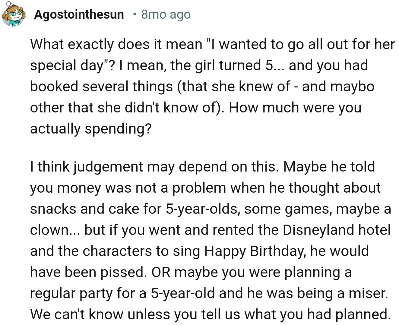 From demanding updates to criticizing her every choice and nitpicking all expenses, his nasty attitude made OP feel awful. She endured it all for the sake of their daughter's happiness; the party was a hit, but the emotional toll was heavy.