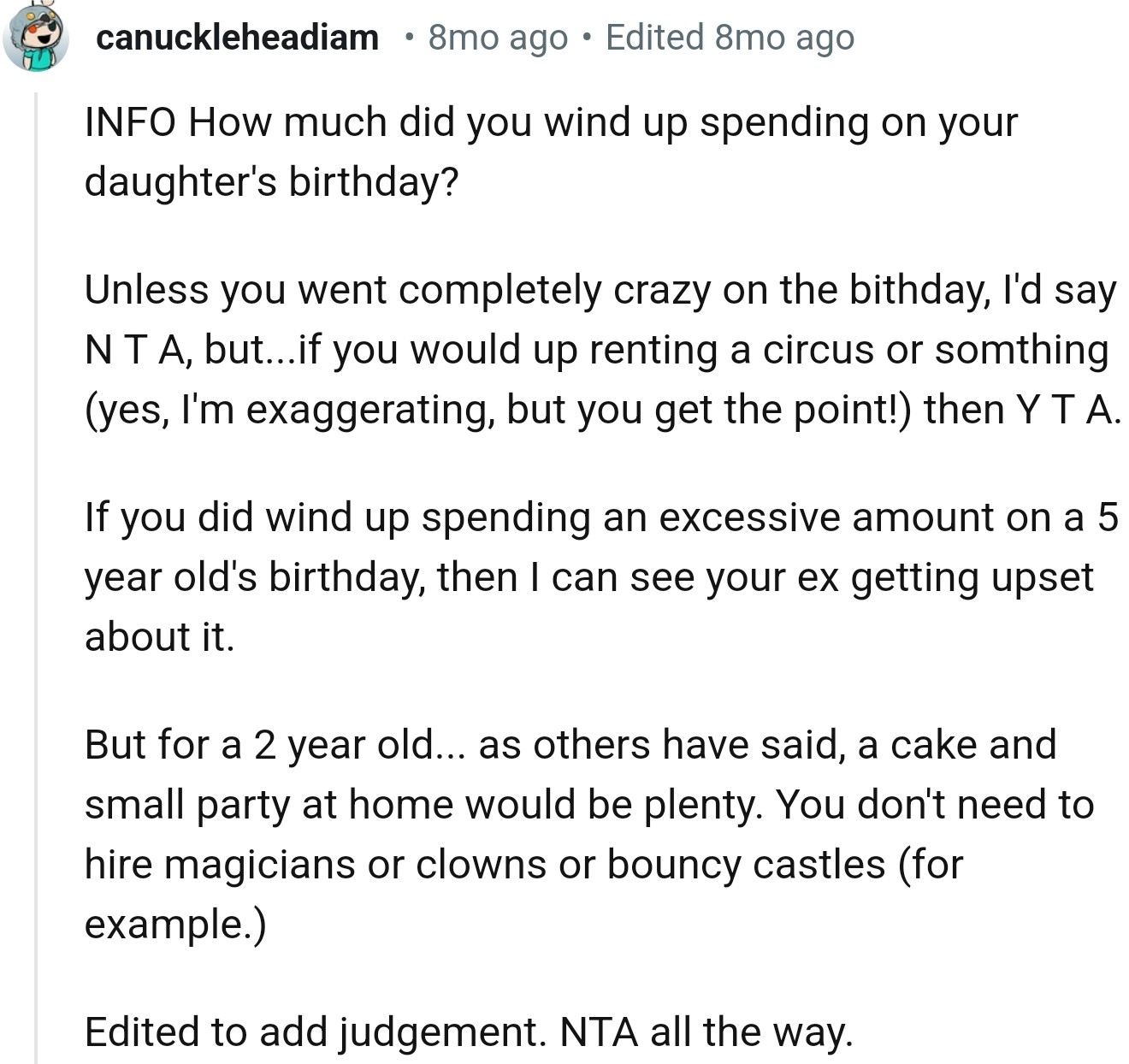 It was their first big event post-breakup, and OP’s ex had generously agreed to foot the bill while leaving all the planning to her. “Spend as much as you want,” he’d said. So, with their daughter struggling with the split, OP decided to pull out all the stops.