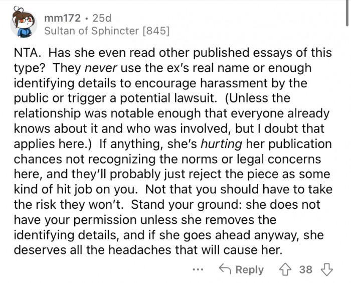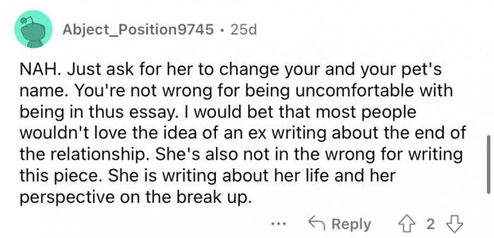 The Redditor shared the story about his ex-girlfriend wanting to publish an essay about their relationship.