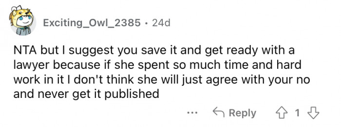 OP's ex went on to say that he is a "character" in the story, so she was hoping for his blessing before publishing it. The Reddit user assumed she had probably included him as a secondary character or given him a brief mention in passing, so he wasn't concerned and told her he would let her know once he had read it.