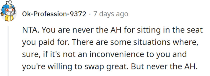 redditThe OP explained his flight was long and the offered seat didn't seem comfortable:
