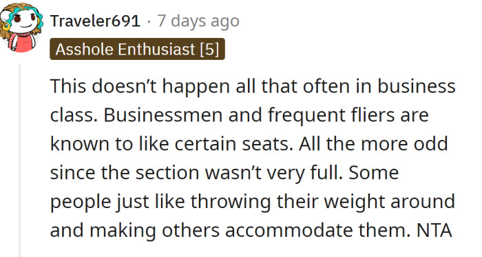 This situation highlights how personal boundaries and comfort can become a source of conflict. The Redditor's decision to prioritize his own comfort, particularly after paying a premium for his seat, points to a need for maintaining autonomy and control over personal space. The father's passive-aggressive response may reflect frustration and a lack of effective communication skills.