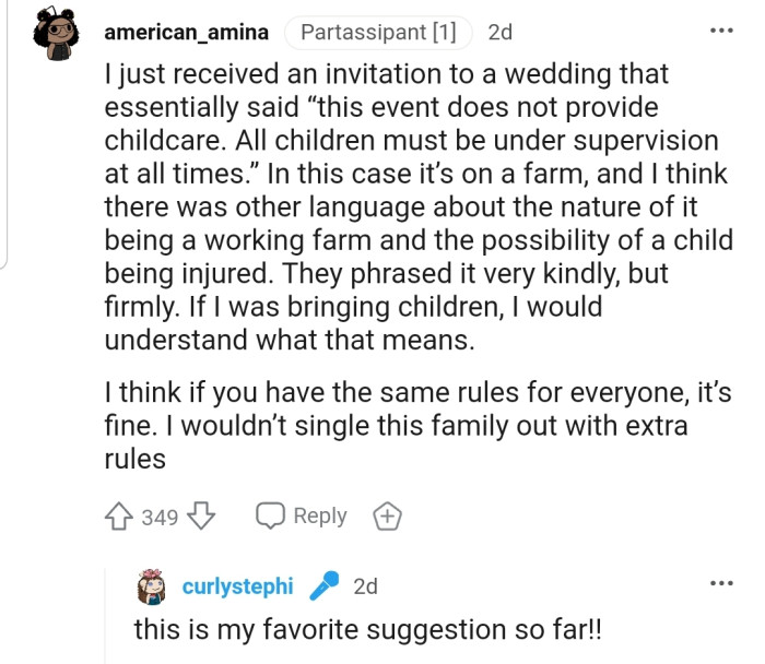 "I just received an invitation to a wedding that essentially said, 'this event does not provide childcare. All children must be under supervision at all times.'"