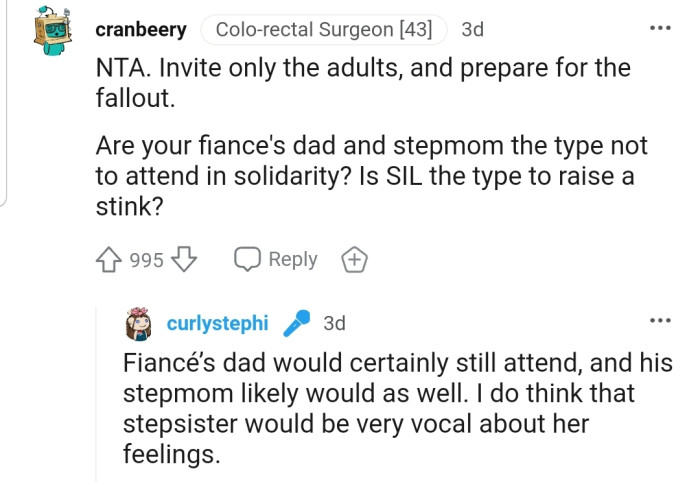 This situation may lead to feelings of resentment on both sides, as the stepsister may perceive the exclusion of her children as a rejection of her role within the family. Understanding these dynamics can be crucial in addressing the underlying motivations behind such requests.