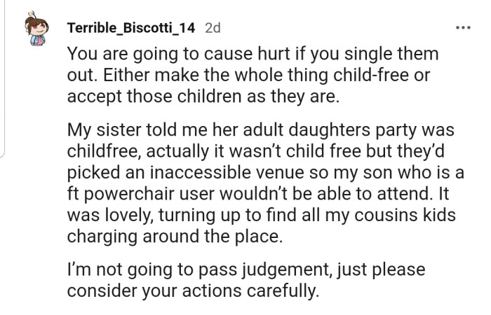 "You are going to cause hurt if you single them out. Either make the whole thing child-free or accept those children as they are."