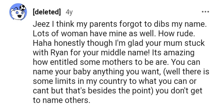 OP's mom relayed this decision to her friends, and one of them ended up telling their manager at work, who was also pregnant. Her boss then stormed into the office, demanding that the baby's middle name be changed. The reason? She had called dibs on the name "Ryan" for her own son.